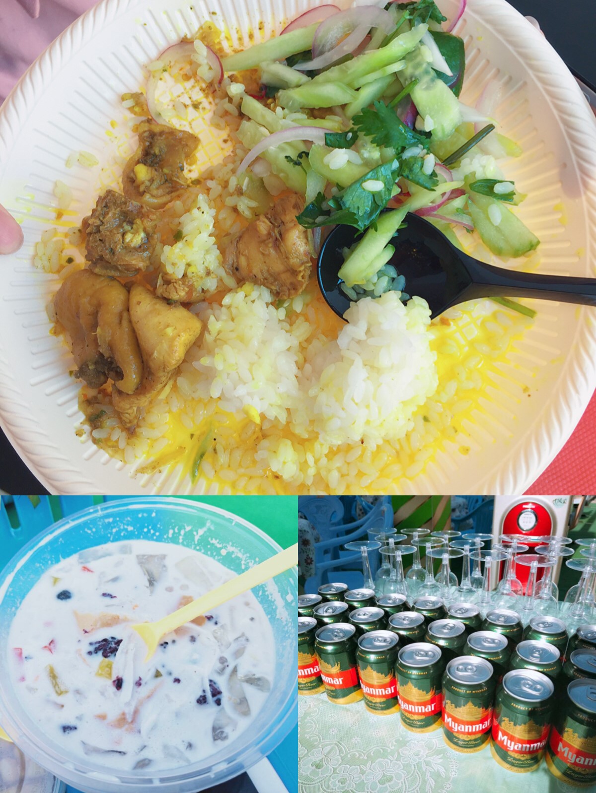 活动期间,大家还品尝到了地道的缅甸美食,总领事馆为来宾精心准备了泡鲁达、咖喱鸡、缅甸啤酒等。来宾们一边品尝缅甸美食,一边观看精彩的表演,尽情享受着视觉与味觉上的盛宴。演出气氛正浓时,吴梭柏总领事起身来到人群中间,将银钵中盛着的特制吉祥水洒向来宾,为大家献上新年的祝福。最后,大家唱起了缅甸传统的新年歌曲《曼山影下》,文艺表演在这美妙的歌声中落下帷幕。