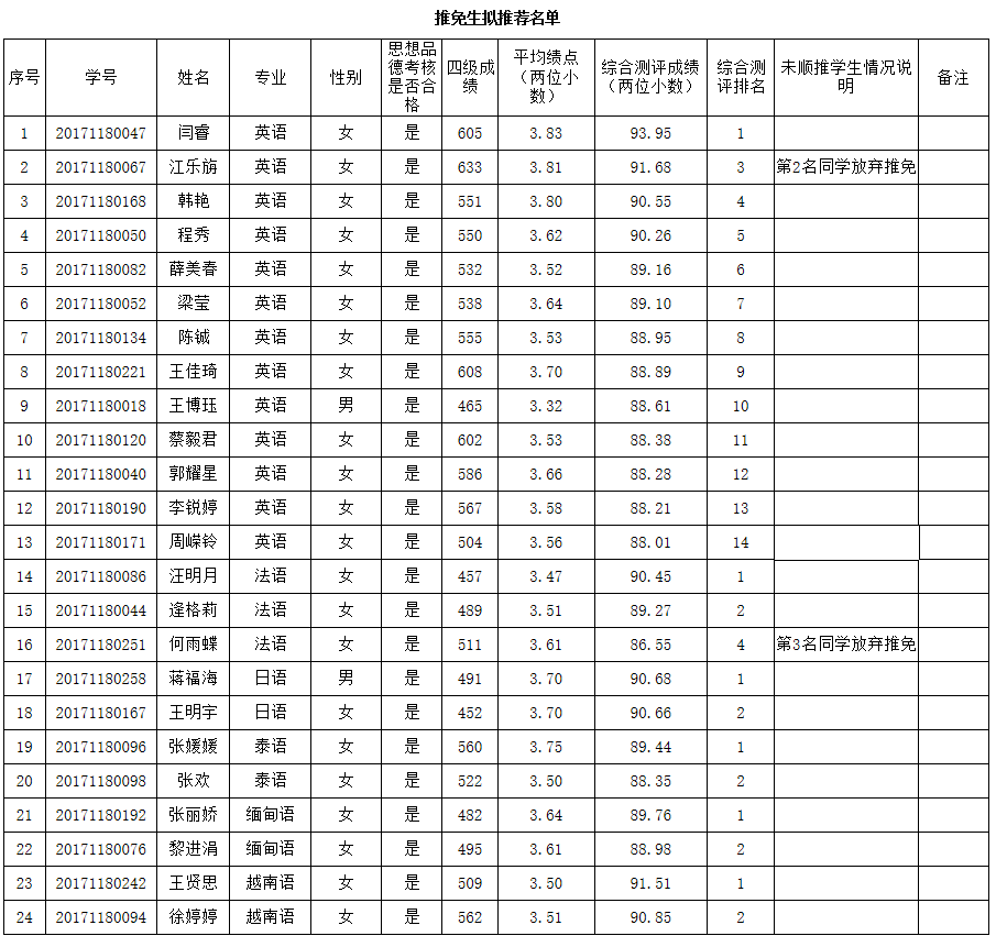 根据教育部《关于进一步规范和加强推荐优秀应届本科毕业生免试攻读研究生工作的通知》(教学厅[2020]12号)、《关于做好2021年推荐优秀应届本科毕业生免试攻读研究生工作的通知》(教学司函[2020]38号)精神,我院按照《云南大学2021年推荐优秀应届本科毕业生免试攻读研究生工作管理办法》《开云官方网页版2021年推荐优秀应届本科毕业生免试攻读研究生工作方案》《外国语学院2021年推荐优秀应届本科毕业生免试攻读研究生补充细则》要求,在学生本人申请、民主推荐、公开评选的基础上,学院推免生遴选工作小组本着公开、公平、公正的原则,严格按推荐条件择优确定初选名单。现将我院2021年免试攻读研究生拟推荐名单公示如下。如有异议,请于2020年9月30日以前到学院办公室反映,联系电话:65033632