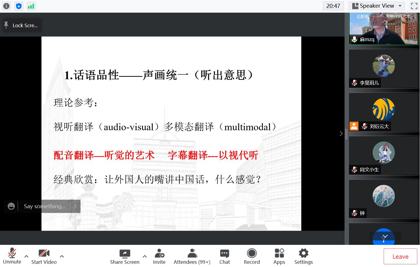 随后,麻教授提到在影视剧翻译过程中,译者追求的不仅是要把“意思说对”,更要努力“把话说好”,并重点分析在翻译时如何“把话说好”,从三个方面——性格化翻译、平面化翻译、立体化翻译——讲解了如何塑造人物形象,并通过一系列翻译实例展现了翻译构建话语的意义和修辞重构的艺术性。