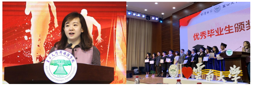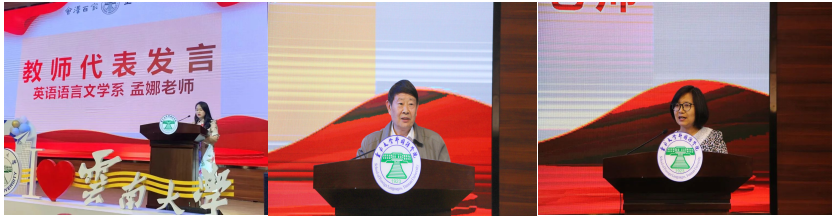 颁奖结束后,英语语言文学系的孟娜、南亚语言文化系的邓兵、东南亚语言文化系的王继琴三位老师作为教师代表依次发言。三位老师言辞恳切而又幽默风趣,回望了过去的几年与同学们相处的时光,表达了对毕业生美好的祝愿和殷切的期望。邓兵老师深切地以泰戈尔的诗结尾“无论你走的多远,我们的心和你们的心都连在一起”,表达了对莘莘学子的深厚情谊 。