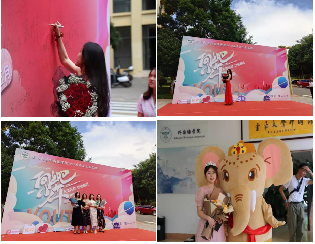 教师代表发言过后,由2018级英语专业本科生周子涵、2018级泰语专业本科生裘清源、2019级亚非语言文学专业硕士研究生孙国丽三位同学作为毕业生代表上台发言。三位同学回望了在云大学习的美好经历,分享了自己的所感、所思、所得,展望了毕业后的发展前景。在讲话的最后,优秀毕业生代表们祝愿同学们都能找准自己人生的罗盘,找寻、寻得、追逐自己的梦想,祝所有老师和同学们平安喜乐、前程似锦。