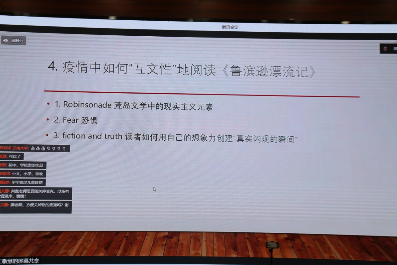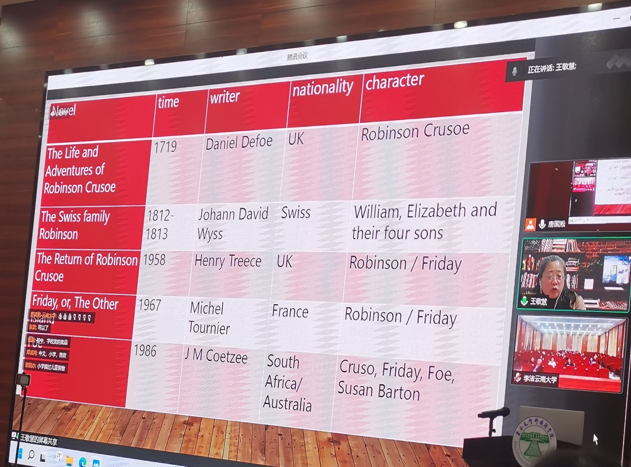 紧接着,王敬慧教授分别展现了《鲁滨逊漂流记》的四部互文性文本,生动形象的向大家讲述了由于客观及主观因素的不同所带来的互文性的不同,并表示“互文性文本”实现了时和空的置换,提供了范式平台进行新的创作。