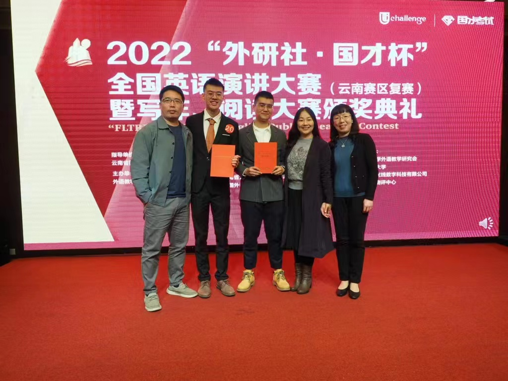 11月4日,2022年“外研社·国才杯”全国英语演讲大赛省级复赛(云南赛区)在昆明理工大学文汇酒店成功举行。我院英语系张新峰老师指导的2019级本科生黄思越同学获得了特等奖第一名的好成绩,将代表云南省参加12月在北京举行的全国总决赛。同时,我院王文俊老师指导的民社院研究生凤杰同学也获得了特等奖,赢得了进军北京决赛的入场券。两位指导老师荣获“外研社·国才杯”全国英语演讲大赛省级复赛(云南赛区)指导教师特等奖。