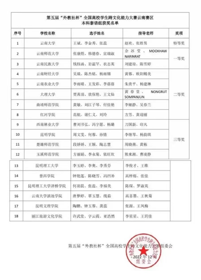 第五届“外教社杯” 全国高校学生跨文化能力大赛云南赛区获奖名单(泰语组)