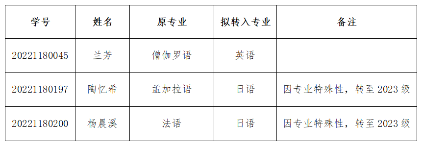 根据《关于2023年春季学期云南大学本科学生自主选择专业工作的通知》,外国语学院经过面试考核,现将2023年春季学期专业分流第二阶段拟接收学生名单公示如下: