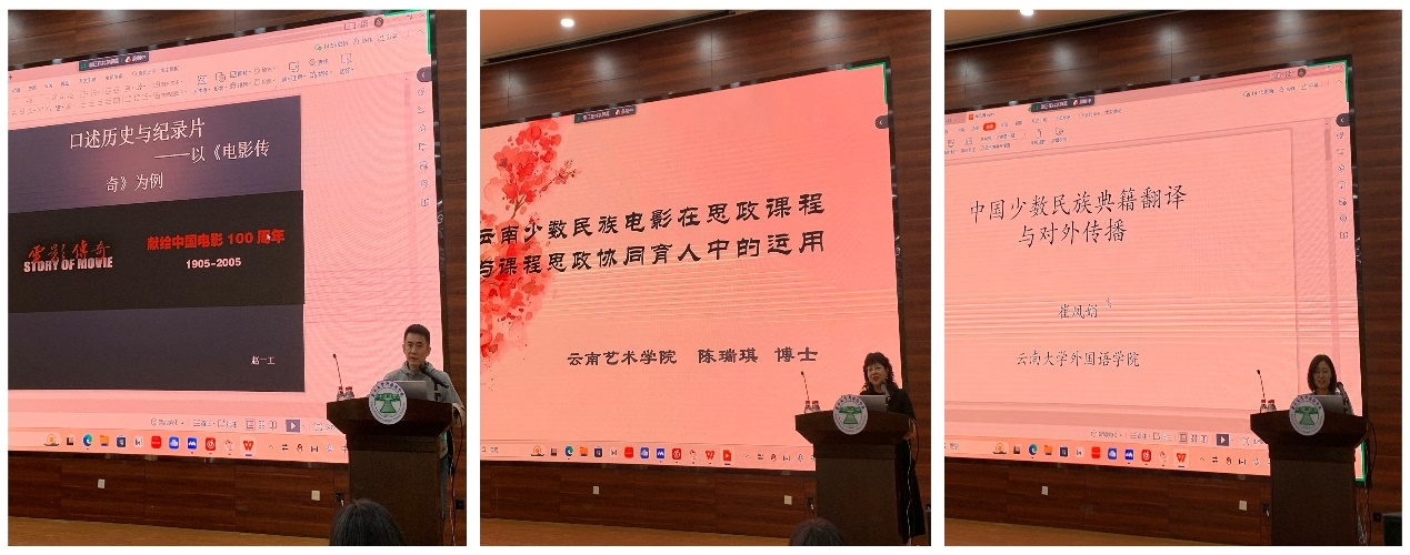 云南艺术学院马克思主义学院陈瑞琪教授演讲的主题是“云南少数民族电影在艺术类高校思政课程与课程思政协同育人的作用”。陈教授首先通过民族舞蹈《布朗花》的翻译案例说明影视译制在中华文化对外传播的重要性;其次提出了艺术类高校思政课程的设计理念,需要立足于艺术学院的特色形成“思政+艺术”的模式;随后,通过分析《阿诗玛》等电影案例,提出将云南少数民族电影引入到课程的必要性和重要性;最后回顾了《去有风的地方》和《心花路放》影视的成绩,以此说明云南少数民族电影成为推动云南经济社会发展的重要宣传介质。