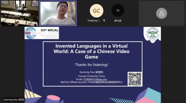 经过匿名评审,郝国荣同学提交的论文成功被WICAL接收,并获得免费参会奖学金。郝国荣同学的发言基于其学士学位论文《虚拟世界中的人造语言:以〈原神〉为例》,该论文获评2023年度“云南大学优秀本科毕业论文”。