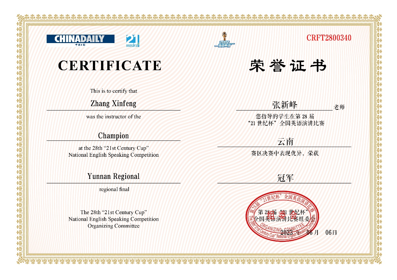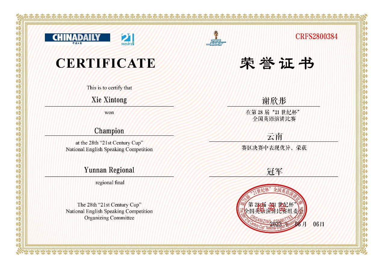 6月18日,第28届“21世纪杯”全国英语演讲比赛云南地区决赛在昆明文理学院落下帷幕。我院英语系张新峰老师指导的2021级本科生谢欣彤同学获得冠军,将代表云南省参加8月举行的全国总决赛。