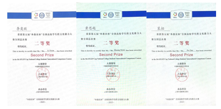 2月24日至26日,由上海外国语大学主办的第五届“外教社杯”全国高校学生跨文化能力大赛全国总决赛在上海举行。40支中国学生队伍和4支国际学生队伍历经校赛和省赛选拔脱颖而出,在全国决赛的舞台上同台竞技、大放异彩。我院本科生黄思越(2019级英语专业)、李奕欣(2020级英语专业)、裴拓(2021级法语专业)三位同学在张新峰老师的指导下取得了全国决赛二等奖的好成绩。