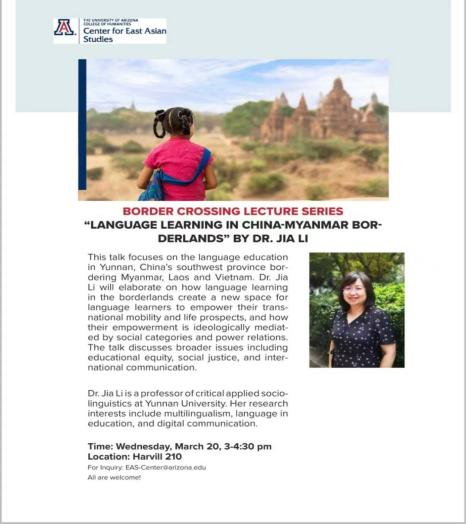 会后我院教师受邀前往亚利桑那大学进行为期两天的学术访问。位于美国图森的亚利桑那大学是核心公立大学,被誉为‘公立常春藤’,世界排名97,有21个学院,本次出访交流的研究机构位于人文学院。人文学院的语言文化教学实力尤为雄厚,有西班牙文、中文、法文、日文、德文、意大利文、俄文、葡萄牙文等本科、硕士和博士课程,还开设非洲研究、韩文、亚裔研究等本科学习的主修或辅修专业。除了上述专业课程之外,该校学生还有机会选修多门小语种课程,如越南语、菲律宾语、泰语、印地语、斯瓦希里语等。访问期间,与东亚研究中心主任Wenhao Diao教授、联合国教科文组织环境历史主席David Pietz教授、人文学院副院长Chantelle Warner教授、文化语言数字教育资源研究中心主任Beatrice Dupuy教授、语言教育政策研究Mary Carol Combs教授、人类语言学Qing Zhang教授会面交流,李佳教授介绍开云官方网页版的专业建设和语言学研究特色,双方就边境地区语言教育研究进行深入讨论。访问期间李佳教授为亚利桑那大学师生进行《中缅边境地区语言学习》讲座(图三),与人文学院的博士生面对面交流,走进课堂为《应用语言学质性研究:基于东亚及其他地区案例》的硕士和博士研究生进行语言文化方面的讲座。