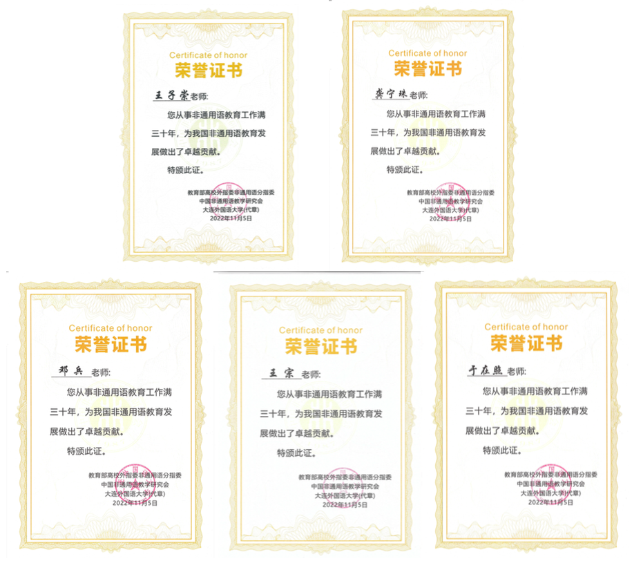 近日,我院邓兵教授、龚宁珠教授、王子崇教授、王宗教授、于在照教授五位教师荣获教育部高校外指委非通用语分指委、中国非通用语教学研究会颁发的荣誉证书,表彰他们从事非通用语教育工作满三十年,为我国非通用语教育发展做出的卓越贡献。