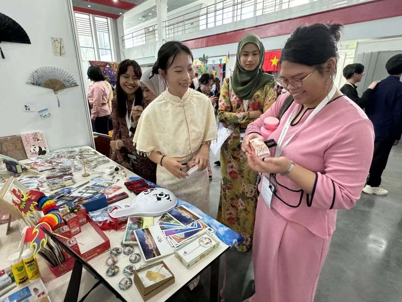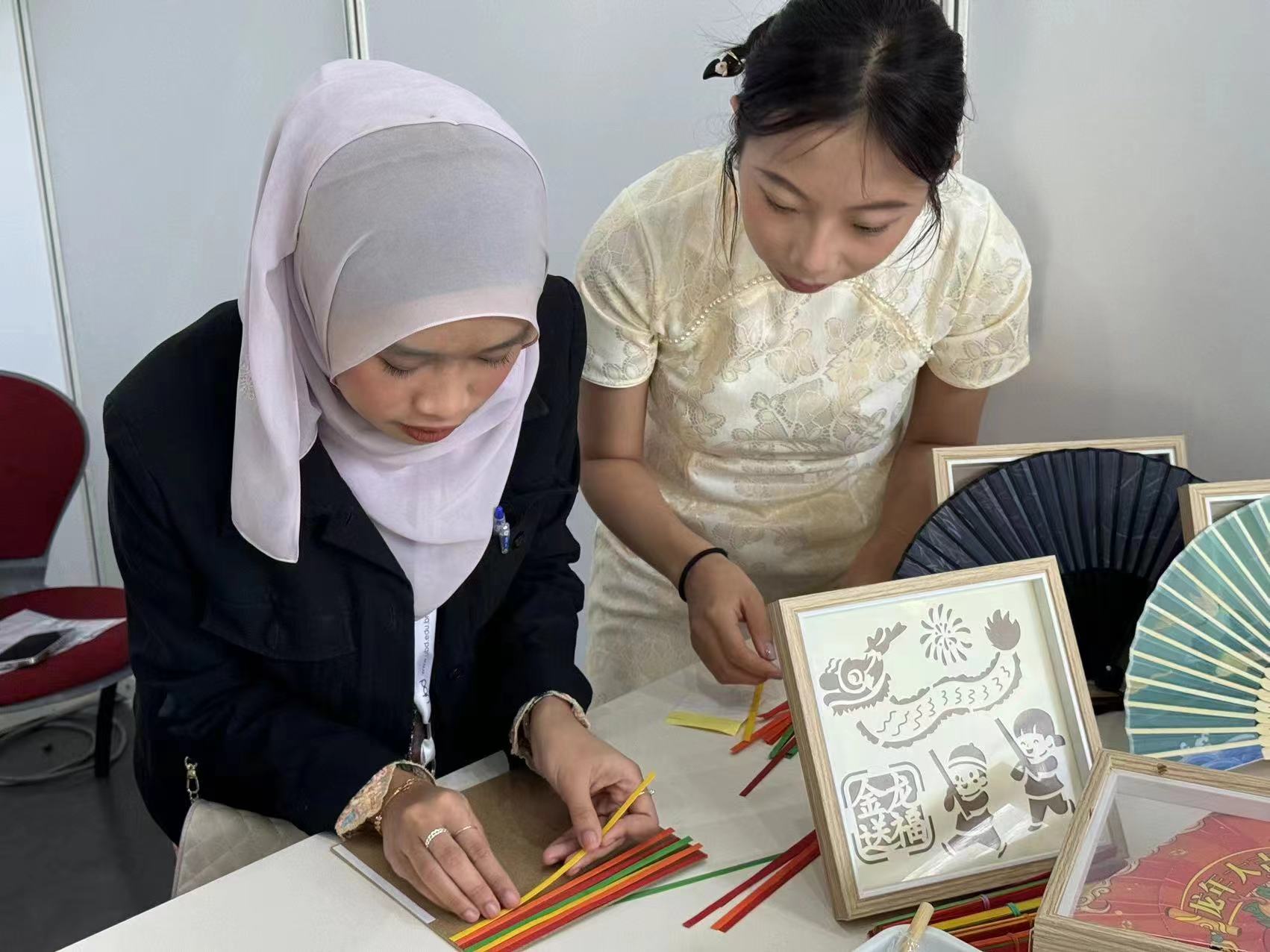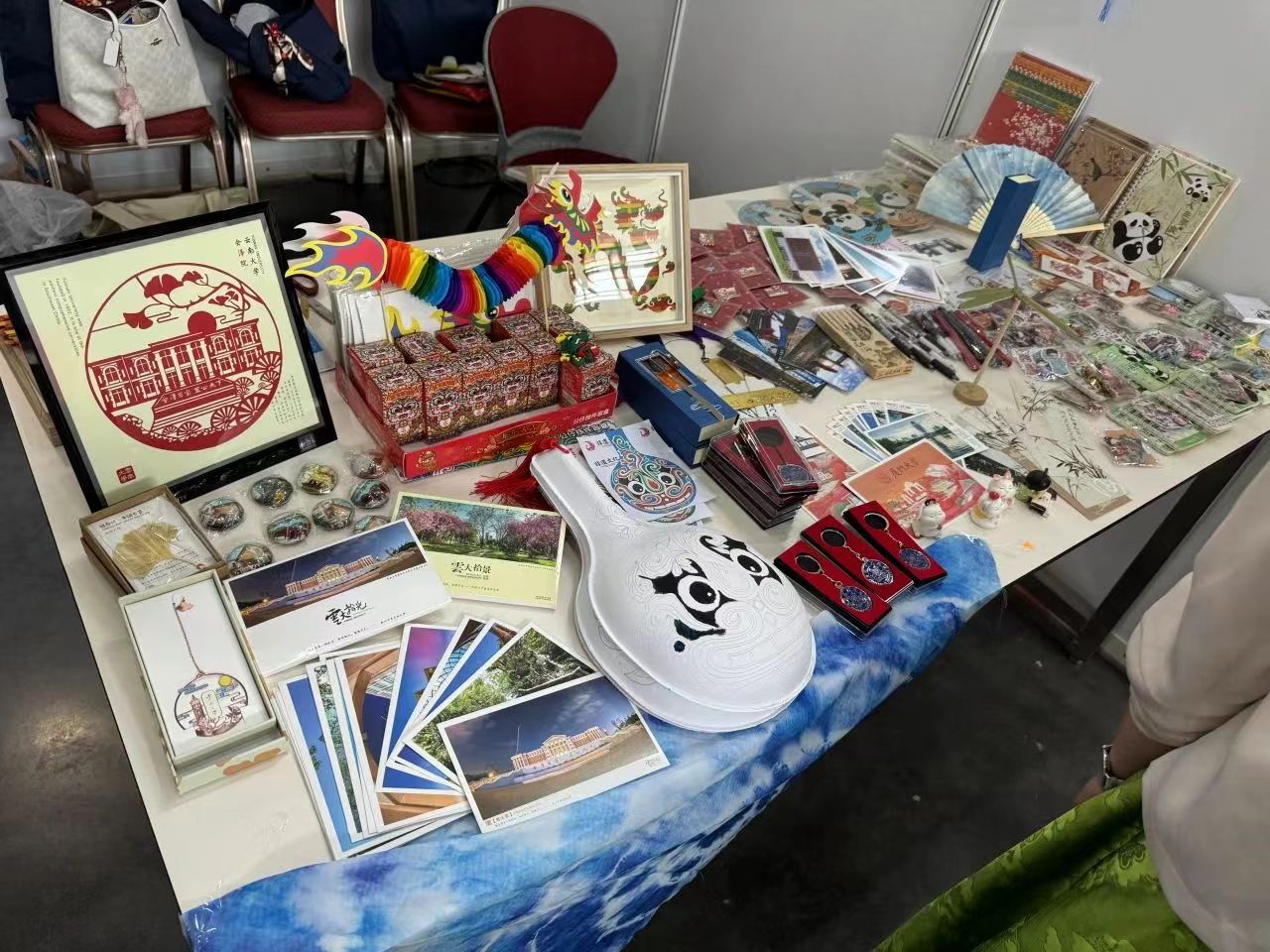 在艺术文化集市上,蕴涵中华传统文化和民族特色元素的文创产品在中国展位展出,吸引了各国青年驻足了解。靳梦璐同学向外国青年展示介绍了云南大学剪纸画、书签、明信片等文创产品,以及充满云南特色的扎染、中国非遗竹编画、手工拉花中国龙、艾草香囊等物件。其中,我校展出的唐朝湿拓画颇受欢迎,各国青年纷纷排队参与制作属于自己独一无二的湿拓作品。在和谐友爱的互动中增进各国青年的交流与了解,是对中国非物质文化遗产艺术瑰宝的有益传播。