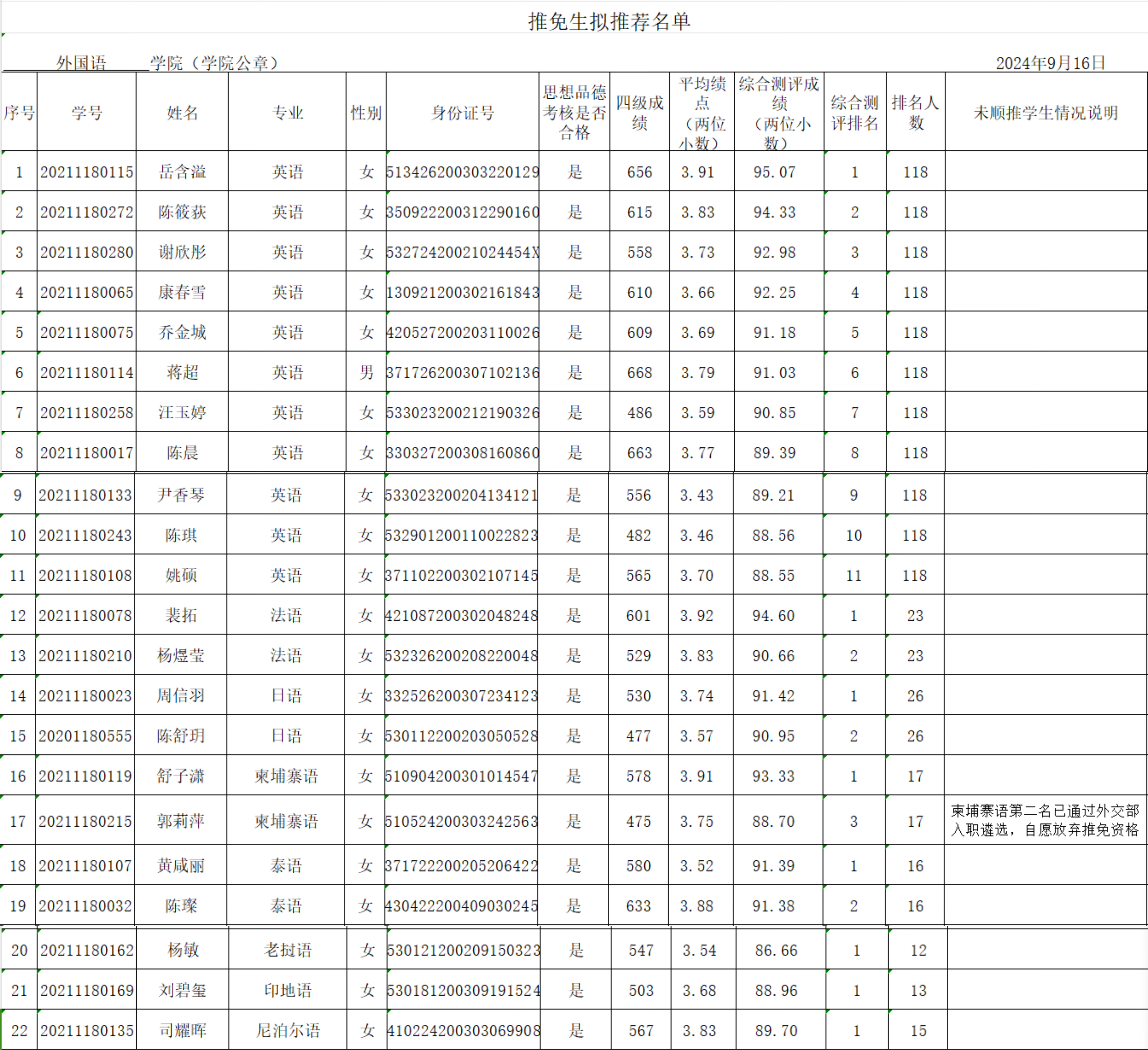 根据教育部相关文件精神,我院按照《云南大学2025年推荐优秀应届本科毕业生免试攻读研究生工作管理办法》要求,在学生本人申请、民主推荐、公开评选的基础上,学院推免生遴选工作小组本着公开、公平、公正的原则,严格按推荐条件择优确定初选名单,现将我院2025年免试攻读研究生拟推荐名单公示如下。如有异议,请于9月22日前到学院办公室反映,联系电话:65034182。