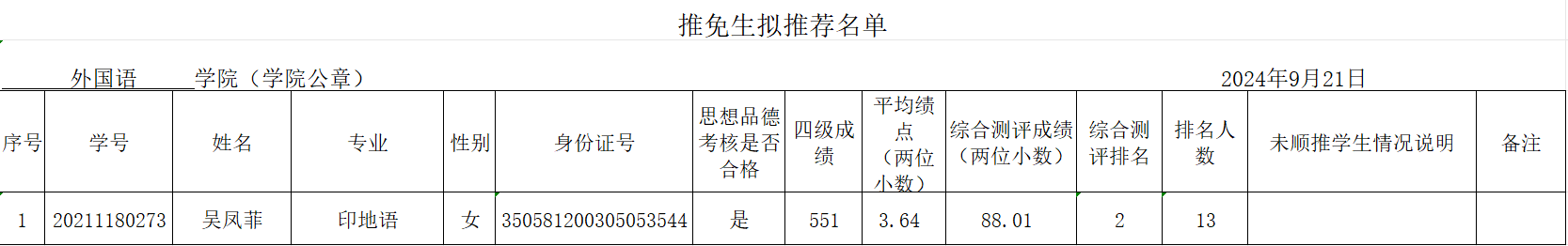 在前期工作的基础上,按照学校相关文件规定,经学校推免工作领导小组批准,为外国语学院追加一个推免名额。经外国语学院推免工作领导小组研究决定,将该追加名额分配至印地语专业。我院按照《外国语学院2025年推荐优秀应届本科毕业生免试攻读研究生工作实施细则(增补)》要求,在学生本人申请、民主推荐、公开评选的基础上,学院推免生遴选工作小组本着公开、公平、公正的原则,严格按推荐条件择优确定初选名单,现将我院2025年印地语专业追加名额下的免试攻读研究生拟推荐名单公示如下。如有异议,请于9月27日前到学院办公室反映,联系电话:65034182。