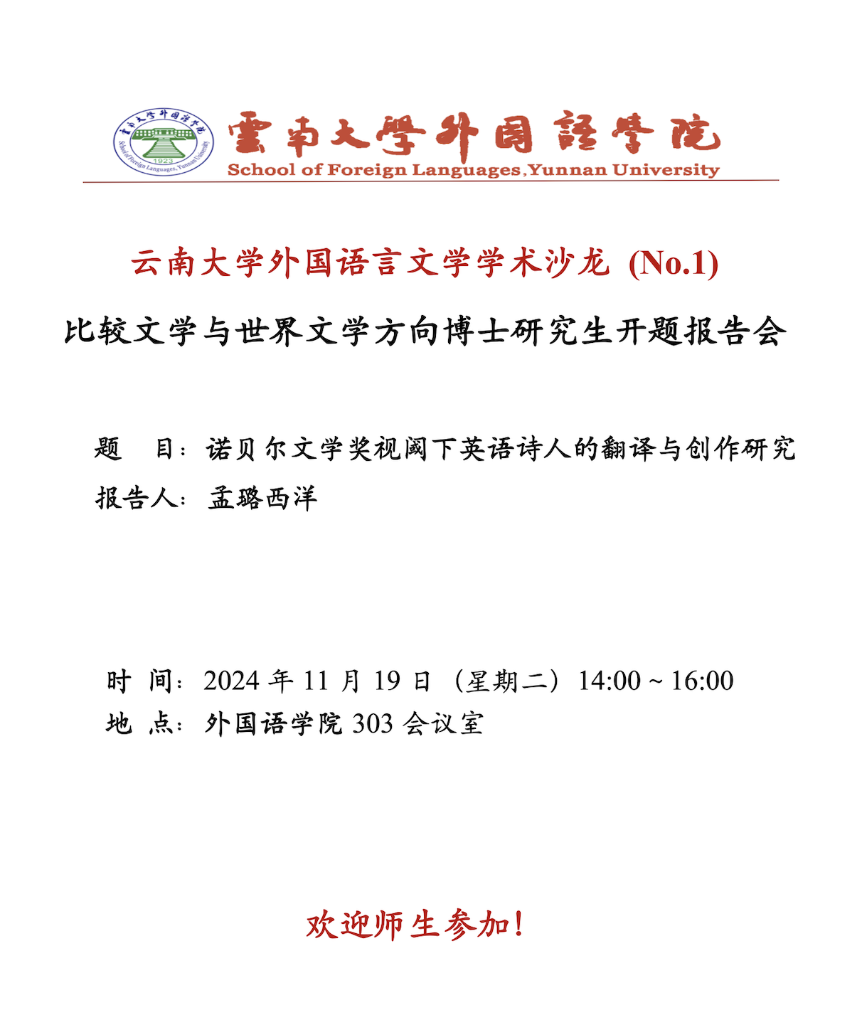 为进一步贯彻落实习近平总书记致云南大学百年校庆贺信精神,按照相关要求完成云大新一轮“双一流”学科建设规划,有效加强云南大学外国语言文学学科的创新发展,外国语学院自2024年起举办外国语言文学学术沙龙,由全院师生共同参与,旨在通过举行讲座、座谈会等系列学术活动促进全院在教学、科研等各方面的学科发展。