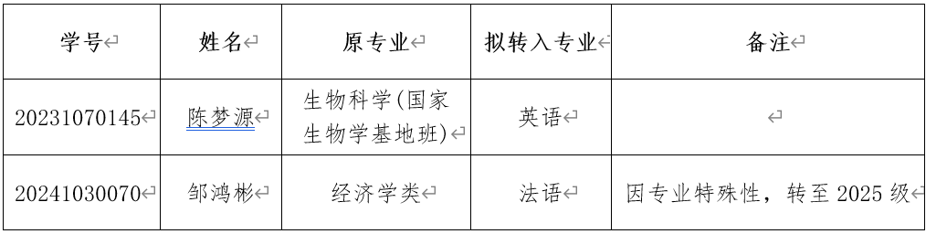 根据《关于2025年春季学期云南大学本科学生自主选择专业的通知》,外国语学院经过面试考核,现将2025年春季学期专业分流第一阶段拟接收学生名单公示如下: