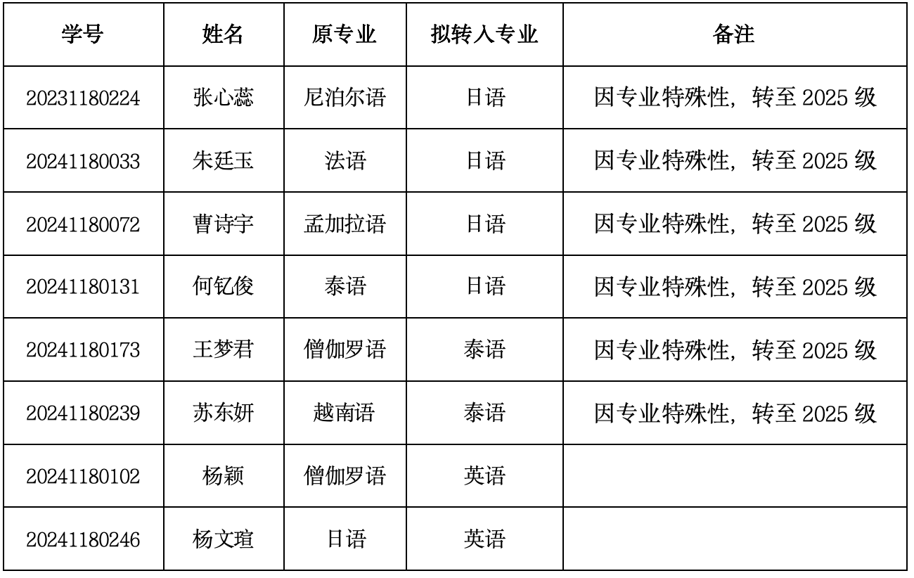 根据《关于2025年春季学期云南大学本科学生自主选择专业的通知》,外国语学院经过面试考核,现将2025年春季学期专业分流第二阶段拟接收学生名单公示如下: