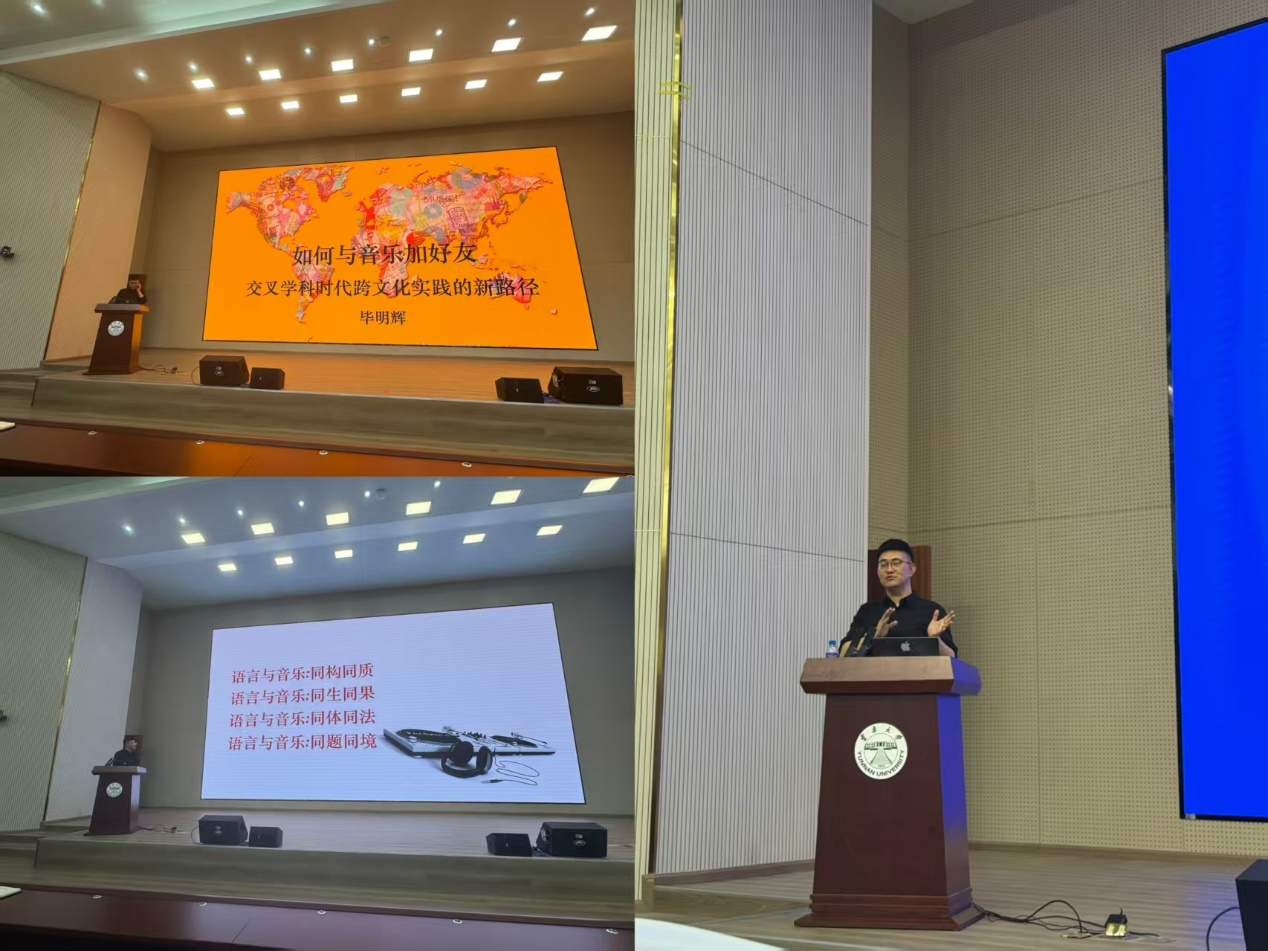 2025年6月6日下午,中国音乐学院毕明辉教授应邀为我院师生做了一场精彩的学术讲座。讲座题目为“如何与音乐加好友:交叉学科时代跨文化实践的新路径”。本次讲座在呈贡校区国家级创新创业学院创客报告厅举行,由我院党委副书记何淼淼老师主持。